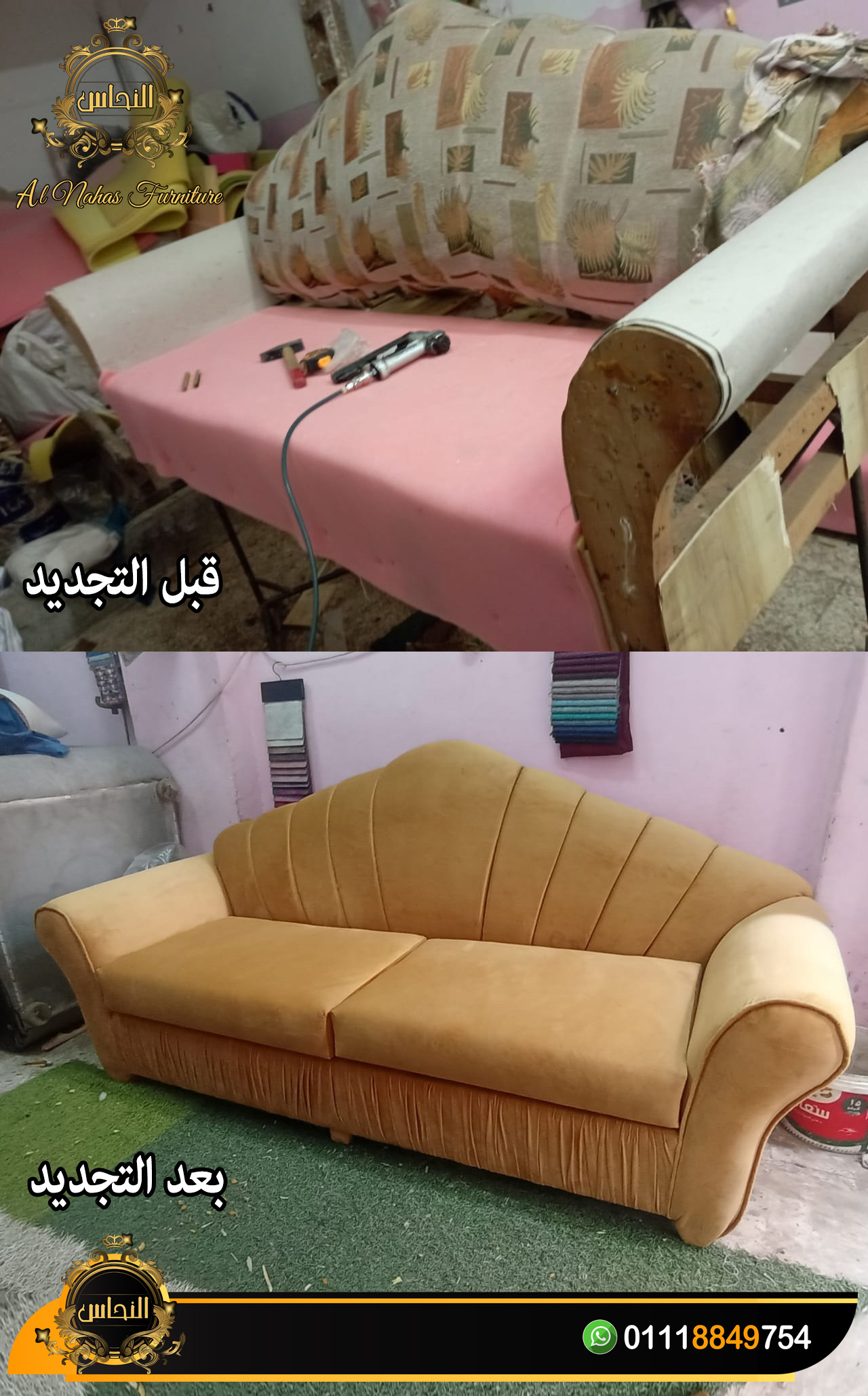 نقوم بتجديد القطع القديمة بدقة وإعادة هيكلتها باستخدام خشب زان وإسفنج عالي الكثافة، مع تنجيد بأقمشة مستوردة لضمان المتانة والشكل العصري.